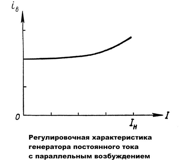 Регулировочная характеристика генератора с параллельным возбуждением имеет почти такой же вид, как и для генератора с независимым возбуждением. Эта кривая сначала почти прямолинейна, но затем загибается вверх, вследствие влияния насыщения магнитопровода машины. Однако при одинаковой нагрузке ток в якорной обмотке генератора с параллельным возбуждением больше, чем ток в якорной обмотке генератора с независимым возбуждением, на величину тока возбуждения . Поэтому в генераторе с параллельным возбуждением при всех прочих одинаковых условиях падение напряжения в якорной обмотке генератора и реакция якоря больше, что требует большего тока возбуждения. Регулировочная характеристика поднимается круче, чем у генератора с независимым возбуждением.