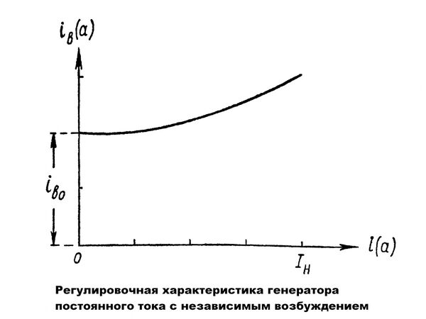 Регулировочная характеристика генератора постоянного тока — зависимость тока возбуждения от нагрузки (силы тока) при постоянном напряжении и постоянном числе оборотов .