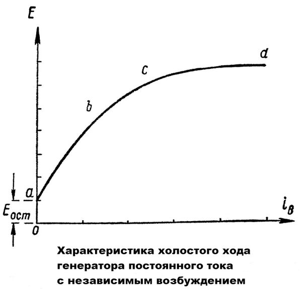 Характеристика холостого хода показывает зависимость электрического напряжения от тока возбуждения при постоянном числе оборотов . Генератор отсоединён от внешней цепи (нагрузка отсутствует). При токе возбуждения ЭДС генератора не равна нулю, а составляет 2…4 % от . Эта электродвижущая сила называется начальной или остаточной ЭДС, обусловлена наличием остаточного магнетизма в магнитной цепи генератора. Затем по мере увеличения тока возбуждения ЭДС растёт, изменяясь согласно кривой, напоминающей кривую намагничивания ферромагнитных материалов.