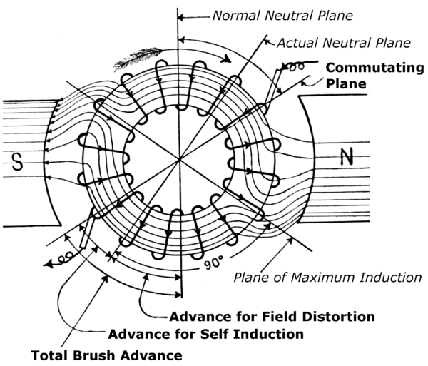 - сдвигая щётки с геометрической нейтрали (Normal neutral plane) за физическую нейтраль (Actual neutral plane), устанавливая их и разворачивая на некоторый угол (на рисунке обозначено Commutating plane), что предотвращает искрение под щётками.