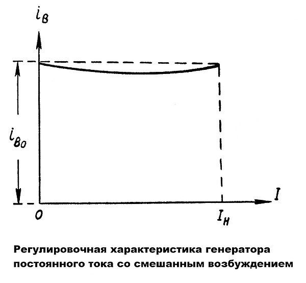 При холостом ходе генератора ток возбуждения равен некоторой величине , а затем с ростом нагрузки он начинает спадать. Это объясняется тем, что с появлением нагрузки вступает в действие последовательная обмотка возбуждения, магнитное поле которой действует согласно с магнитным полем параллельной обмотки возбуждения. Для поддержания постоянства результирующего магнитного потока, а значит, и постоянства напряжения на зажимах генератора необходимо вначале несколько снижать ток возбуждения в параллельной обмотке возбуждения.