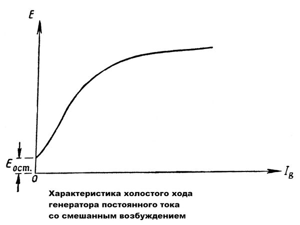 Так как генератор при холостом ходе отключен от внешней цепи, то его нагрузка равна нулю . Ток возбуждения в последовательной обмотке возбуждения также равен нулю. Характеристика холостого хода генератора постоянного тока со смешанным возбуждением аналогична характеристике холостого хода генератора постоянного тока с параллельным возбуждением.