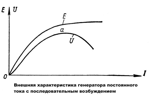 Внешняя характеристика: напряжение на зажимах генератора вначале растёт вместе с нагрузкой (участок кривой), а затем начинает уменьшаться. Это объясняется так: вначале с ростом нагрузки растёт и ток возбуждения , так как . Следовательно, растут электродвижущая сила и напряжение на зажимах генератора. Однако по мере увеличения нагрузки напряжение на его зажимах начинает спадать, потому что падение напряжения внутри якорной обмотки становится всё более ощутимым. Кроме того, электродвижущая сила генератора по мере магнитного насыщения стали генератора увеличивается очень мало, поэтому, невзирая на её некоторый рост, напряжение на зажимах генератора после некоторой предельной нагрузки начинает уменьшаться.
