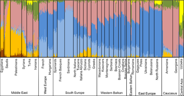 Многие европейцы являются потомками жителей Ближнего Востока (согласно анализу гаплогруппы Н), переселившихся на запад в эпоху неолитической революции[14]. Вторая миграционная волна предположительно связана с распространением индо-европейских народов с территории южной России (курганная гипотеза). Высокое генетическое сходство народов с побережья Средиземного моря объясняется греческой колонизацией I тыс. до н. э.