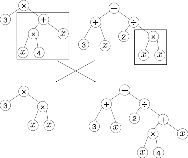В древовидном представлении оператор скрещивания реализуется обменом между двумя деревьями какими-либо узлами вместе с их потомками (поддеревьями).
