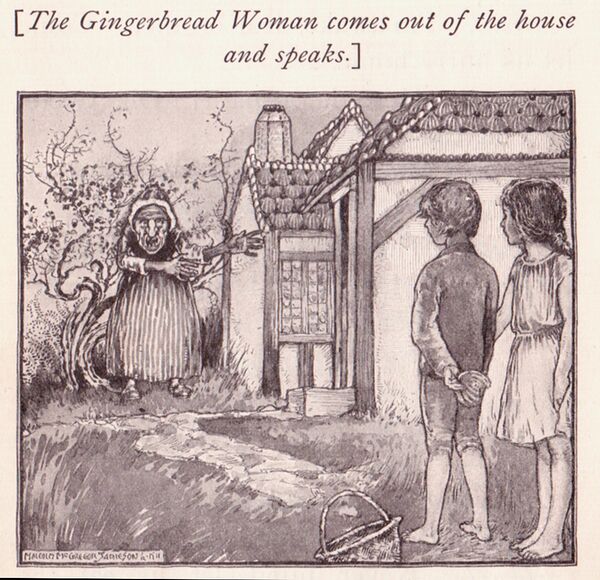 - Гензель и Гретель. Иллюстрация Ф. Грот-Иоганна (1900): «Ведьма морщиниста и клыкаста, но глаза у неё — слишком человеческие. Фермерское хозяйство сглаживает впечатление от жилища мертвеца»[11]