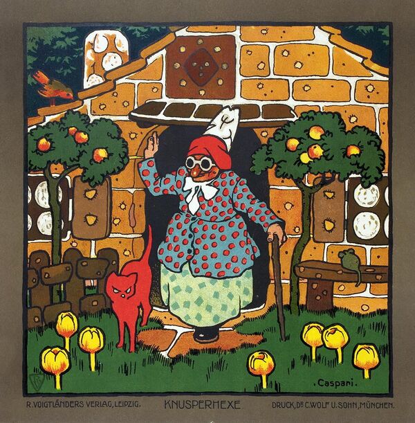 - Гензель и Гретель. Иллюстрация Р. Шольца (1904): «Лучшая из всех ведьм. Ухмыляясь, она подслеповато тянет свою когтистую лапу к детям, а совиные глаза смотрят в пустоту»; «Печь чересчур велика, но зато понятно, как Гретель удалось впихнуть туда ведьму»; «У этой старухи та же юбка, но другой головной убор и только один костыль»[11]