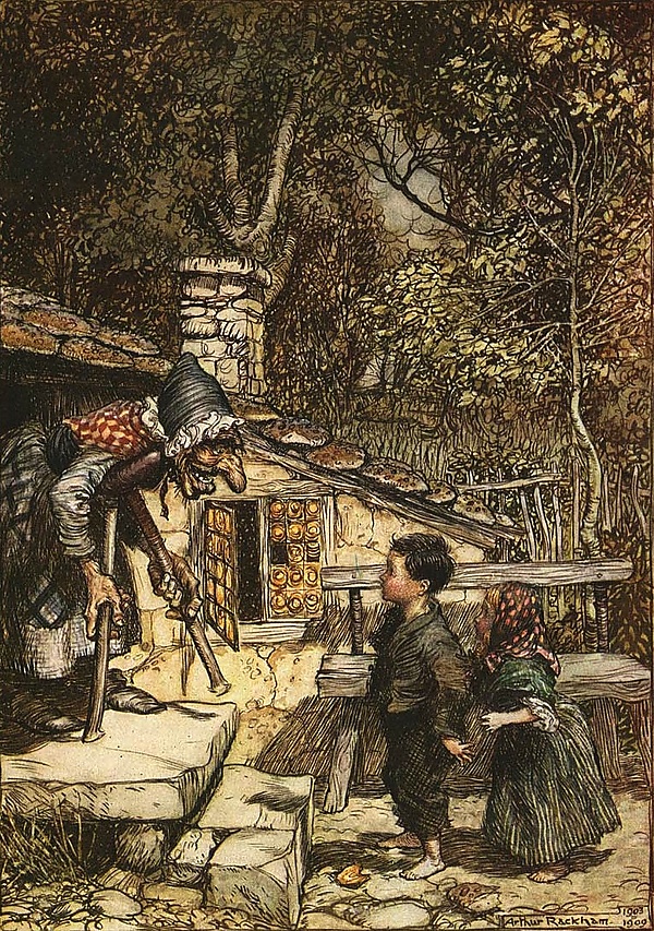 - Гензель и Гретель. Иллюстрация А. Рэкема (1909): «Свойственный художнику гротеск проявился в носе, бородавках ведьмы и в двух костылях вместо одного»[11]