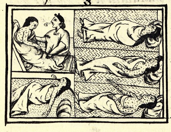 Немалая часть смертей была связана с заболеваниями натуральной оспой[51]. Уже в 1507 году первый случай заболевания оспой был замечен на Испаньоле (Гаити); в 1520 году вместе с испанскими переселенцами с Испаньолы оспа последовала на материк. По свидетельству Торибио де Бенавенте (Мотолиниа), индейцы были беспомощны перед оспой, которая производила на них чудовищное действие — заболевшие покрывались страшными язвами; вымерло до половины населения провинций Центральной Мексики[52]. Массовые эпидемии оспы во многом обусловили падение империй ацтеков и инков[51]. Примечательно, что оспа добралась до земель инков раньше, чем испанские конкистадоры — в 1526 году, за пять лет до испанского вторжения, от неё умер правитель инков Уайна Капак[53]. По современным оценкам, за 1524—1527 годы из 6 млн населения инкской империи умерло не менее 200 тысяч человек[51]. Эпидемии оспы повторялись на южноамериканском континенте каждые десять-двадцать лет; к 1578 году они затронули даже малодоступные внутренние районы Бразилии, куда болезнь занесли миссионеры. В созданных иезуитами поселениях на берегах великих южноамериканских рек — до 100 000 индейцев — не позднее 1660 года от инфекционных болезней умерло 44 тысячи обитателей, а в повторившейся в 1669 году эпидемии — ещё 20 тысяч[51].