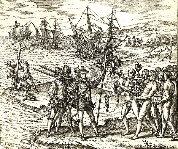 После королевской экспедиции в «Новый мир» в Испании появилось много «охотников» за золотом, которые организовывали частные экспедиции. Испанская монархия взимала с них 1/3 часть, а позже 1/5[7]. Короли наделяли колонистов землями и позволяли им принуждать живущих на них аборигенов сеять поля и сажать огороды для «новых хозяев». Испанцы не только устанавливали законы, по которым карали индейцев смертью, но и зачастую просто спорили, кто сможет разрубить человека одним ударом сабли сверху донизу. За одного убитого испанца убивали сто индейцев[8]. С момента ввоза на континент собак испанцы кормили их убитыми индейцами[8][9].