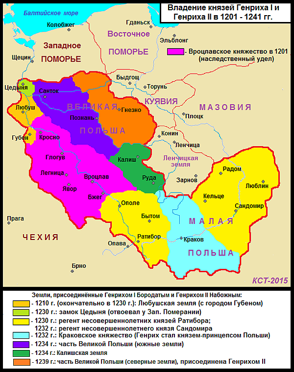 После смерти в 1238 году Генриха Бородатого, Генрих II Набожный унаследовал Вроцлавское, Великопольское и Краковское княжества с титулом князя-принцепса Польши. Он также получил регентство над Опольско-ратиборским княжеством в Верхней Силезии и Сандомирским княжеством, но уже в 1239 году ему пришлось передать фактическую власть достигшим совершеннолетия Мешко и Владиславу Опольским в Верхней Силезии и Болеславу V Стыдливому в Сандомире.
