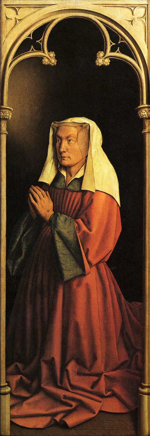 На внешней стороне алтаря изображён донатор и его жена, молящиеся перед статуями Иоанна Крестителя и Иоанна Богослова. В среднем ряду изображена сцена Благовещения. Фигуры Девы Марии и архангела Гавриила разделены изображением окна, в котором виден городской пейзаж, который, как считается, соответствовал виду из окна в доме Вейдтов.