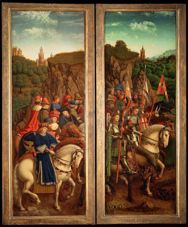 На правых боковых створках изображены шествия отшельников и пилигримов. На левых створках — шествие воинства Христова и Праведных Судей.