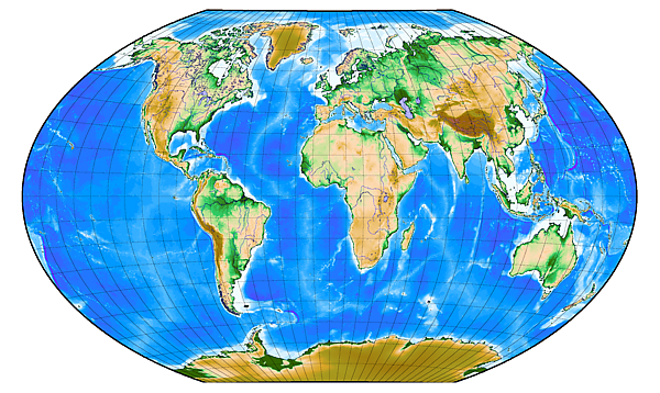 - Цилиндрическая проекция — искажения увеличиваются от экватора к полюсам.