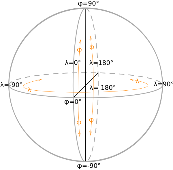 Долгота́ — двугранный угол λ между плоскостью меридиана, проходящего через данную точку, и плоскостью начального нулевого меридиана, от которого ведётся отсчёт долготы. Долготу от 0° до 180° к востоку от нулевого меридиана называют восточной, к западу — западной. Восточные долготы принято считать положительными, западные — отрицательными.