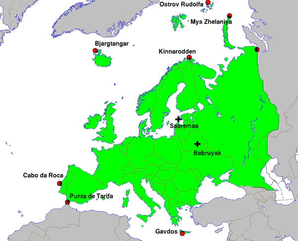 Границы Европы, использовавшиеся венскими учёными для вычислений, неизвестны, но по описаниям принимались во внимание крайние значения по широте и долготе, после чего вычислялся геометрический центр. Знак расположен по координатам 47°57′40″ с. ш. 24°11′10″ в. д.GЯO, на берегу реки Тиса. Австрийские географы также отметили гору Тилленберг (высота 939 м) около богемского города Хеб и немецкого Нойальбенройта, поместив там медную табличку с надписью о центре Европы[8].