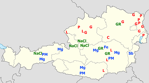 Важнейшие полезные ископаемые: нефть (23 млн т) и газ (20 млрд м³) (Венский бассейн), магнезит (Штирийские Альпы — Файч), бурый уголь (Штирия, Верхняя Австрия); имеются месторождения железных (гора Эрцберг, в районе Эйзэнерца) и свинцово-цинковых (район Клагенфурта — Блейберга и др.) руд, графита, солей. Минеральные источники — Баден, Бад-Ишль.