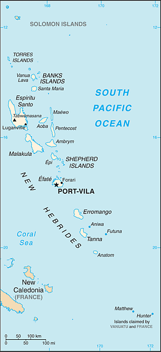 Государство Вануату, которое ранее называлось Новые Гебриды, находится в Океании, на одноимённом архипелаге Вануату, на котором расположено полностью. Официально самым южным островом страны является остров Анейтьюм, однако Республика оспаривает у Новой Каледонии более южные острова Матью и Хантер[1][2].