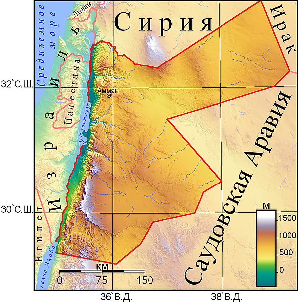 Большую часть территории страны занимает пустынное горное плато высотой от 700 до 1200 м, разделённое долинами и ущельями на несколько районов. Район к востоку от долины реки Иордан является крайней северной оконечностью Восточно-Африканской рифтовой долины, которая через залив Акаба и Красное море тянется вплоть до Великих озёр Африки. Несмотря на то, что Иордания находится в сейсмически активной зоне Земли, каких-либо серьёзных землетрясений на протяжении последних столетий в стране не наблюдалось. Юг и юго-восток страны занимает Сирийская пустыня, которая является, по сути, продолжением Аравийской пустыни. Северная часть пустыни представлена лавовыми полями и базальтом, а южная — обнажениями песчаника и гранита. Рельеф страны подвергается сильному выветриванию, главным образом эоловым процессам. Долина Иордана понижается вплоть до 400 м ниже уровня моря вблизи Мёртвого моря, которое является глубочайшей впадиной на поверхности Земли[2].
