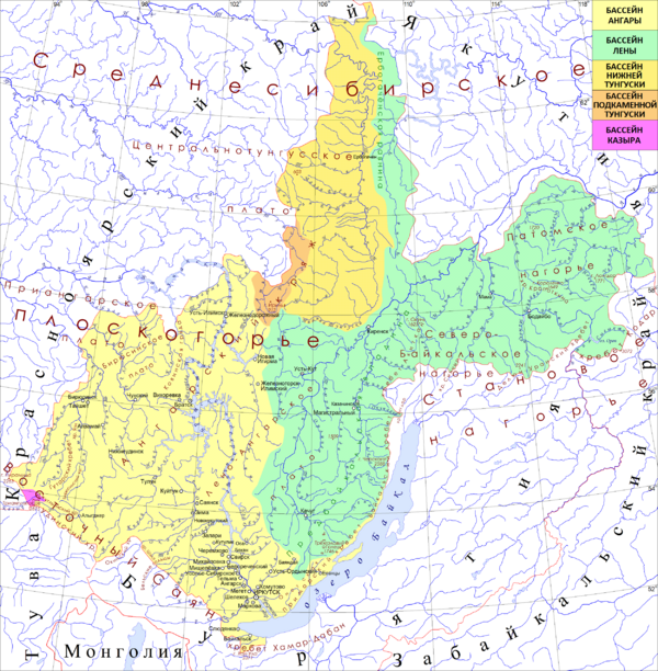 Речную сеть составляют бассейны рек Лена с притоками Киренга, Витим; Ангары с притоками Белая, Ока, Ия, Китой, Иркут, Илим, Бирюса, Куда; Нижняя Тунгуска и частично Подкаменная Тунгуска[9].