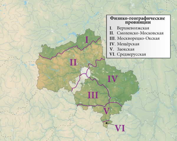 Территория Московской области относится к шести физико-географическим провинциям[119][120]: Верхне-Волжской, Смоленско-Московской, Москворецко-Окской, Мещёрской, Заокской и Среднерусской. Иногда вместо Смоленско-Московской возвышенности рассматривают отдельно Смоленскую и Московскую провинции[121].