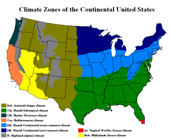 Из-за большого размера страны, её протяжённости и широкого разнообразия географических особенностей на территории США можно найти районы с практически любыми климатическими характеристиками. Бо́льшая часть США (штаты, расположенные к северу от 40 градуса с. ш.) располагается в зоне умеренного климата, южнее преобладает субтропический климат, Гавайи и южная часть Флориды лежат в зоне тропиков, а север Аляски относится к полярным регионам. Великие равнины к западу от 100-го меридиана относят к полупустыням, Большой Бассейн и области вокруг него имеют аридный, а прибрежные районы Калифорнии — средиземноморский климат. Тип климата в границах одного пояса может существенно меняться в зависимости от рельефа, близости океана и других факторов. Благоприятный климат оказал немалое влияние на заселение материка европейцами и во способствовал занятию США лидирующих позиций в мире.