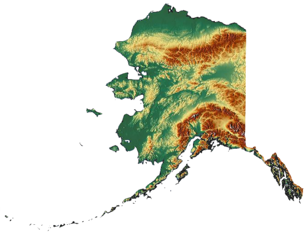Большая часть территории штата Аляска занята горными хребтами, вытянутыми с запада на восток. Северная часть штата занята плоской Арктической низменностью, обрамлённой с юга хребтом Брукса, в состав которого входят горы Де-Лонга, Эндикотт, Филип-Смит и Британские горы. В центральной части штата расположено плоскогорье Юкон, по которому протекает одноимённая река. Алеутский хребет изгибается дугой вокруг долины реки Суситна и продолжается в виде Аляскинского хребта, формируя полуостров Аляска и Алеутские острова. На Аляскинском хребте расположена высочайшая вершина США — гора Денали (6193 м). Вдоль побережья Аляскинского залива тянутся Чугачский хребет, хребет Святого Ильи и горы Врангеля.