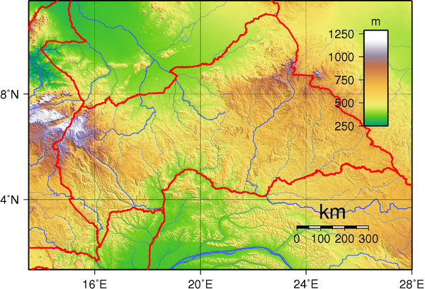Самая высокая точка — гора Нгуи (Нгауи, фр. Mont Ngaoui) — 1410 м, самая низкая — 335 м (река Убанги на границе с ДРК).