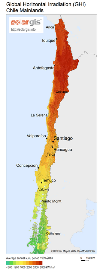 Чили занимает узкую полосу вдоль тихоокеанского побережья континентальной Южной Америки от пустыни Атакама (17° южной широты) до мыса Фроуорд (54° южной широты) Является самой протяжённой страной в мире, вытянутой с севера на юг. В южной части страны у побережья находится множество островов, крупнейший из которых — Огненная Земля (разделен с Аргентиной). Также к Чили относятся несколько удалённых островов в Тихом океане — архипелаги Хуан-Фернандес и Ислас-Десвентурадас, остров Пасхи со скалой Сала-и-Гомес. Кроме того, Чили претендует на сектор в Антарктике. Чили контролирует стратегические проходы из Атлантического в Тихий океаны на юге (Магелланов пролив, проливы Бигл и Дрейка). Пустыня Атакама на севере страны — самое сухое место на планете. В кратере горы Охос-дель-Саладо расположено самое высокое озеро в мире (высота 6 390 м)[2]