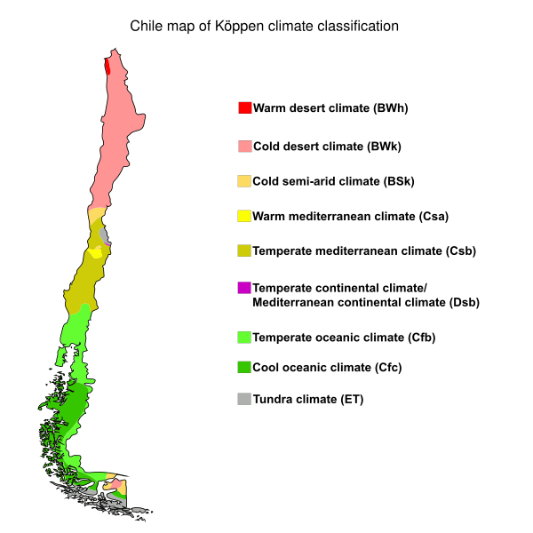На побережье Чили климат в основном холоднее, чем на той же широте в других прибрежных районах. Это связано с мощным холодным течением Гумбольдта, ответвлением течения Западных ветров, которое влияет на климат вплоть до Галапагосских островов, лежащих практически на экваторе.