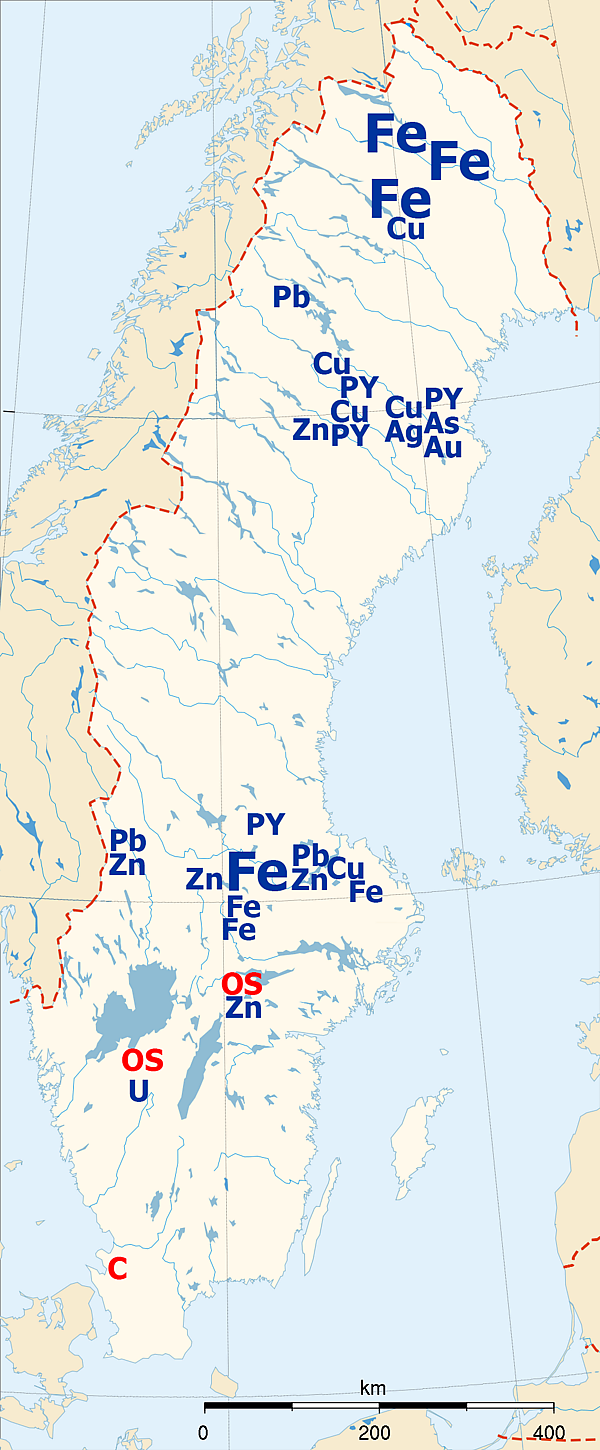 Недра Швеции богаты металлами, присутствуют месторождения руд железа, меди, титана, пиритов, цинка, урана, серебра. Значительные месторождения металлических руд связаны с обширными выходами магматических и метаморфических пород. Ограниченное же распространение осадочных пород обусловило практическое отсутствие залежей каменного угля, нефти и природного газа. Шведские железорудные месторождения относятся к богатейшим в мире как по концентрации запасов руды, так и по содержанию в ней металла. Месторождения железных руд располагаются главным образом в провинциях Норботтен и Бергслаген. Руды известны по всей стране. Около 100 медноколчеданных месторождений и рудопроявлений расположены в провинции Норботтен, плюс столько же — в Центральной Швеции, в провинциях Вестерботтен и Бергслаген.