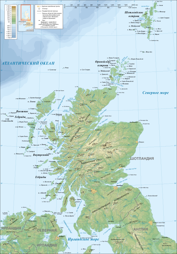 В топографии Шотландии выделяется Северо-Шотландский разлом — геологический разлом, проходящий по материковой части от Хеленсборо до Стонхейвена[5]. Граница разлома разделяет две совершенно разных физиографических региона — Северо-Шотландское нагорье (занимающее север и запад страны), и Среднешотландскую низменность, которая южнее переходит в Южно-Шотландскую возвышенность[6]. В центральной части нагорья, в Грампианских горах, находятся основные горы Шотландии, в том числе и самая высокая её точка — пик Бен-Невис (1344 м). Среднешотландская низменность является наиболее густонаселённым регионом страны — на узком участке между заливами Ферт-оф-Клайд и Ферт-оф-Форт, известном как «Центральный Пояс»[6] находятся крупнейшие города страны. Самым большим является Глазго, но, тем не менее, столицей и политическим центром страны является Эдинбург[7].