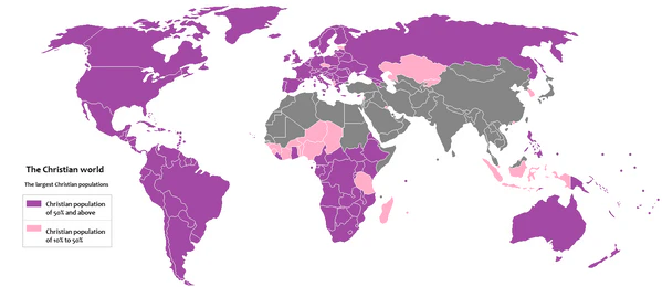 Христианство — это самая крупная мировая религия, возникшая около 33 года в Палестине вокруг жизни и учения Иисуса Христа, описанных в Новом Завете[2]. Оно насчитывает более 2 миллиардов последователей и распространено по всему миру. В 1054 году произошёл раскол христианской церкви на католическую (с центром в Риме) и православную (с центром в Константинополе). Появление протестантизма стало результатом реформационного движения в Католической церкви в XVI веке.
