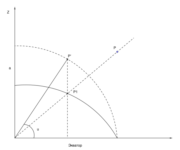 Приведенной широтой точки эллипсоида называют геоцентрическую широту точки являющейся проекцией точки на вспомогательную сферу радиуса а нормалью к плоскости экватора. Приведенная и геодезическая широта связаны равенством: