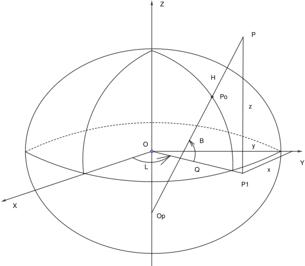 Геодезические прямоугольные и эллипсоидальные системы согласованы друг с другом. Центры этих систем совмещены, ось прямоугольной системы проходит вдоль малой оси эллипсоида, оси и совпадают. Связь систем устанавливают формулы представленные ниже.