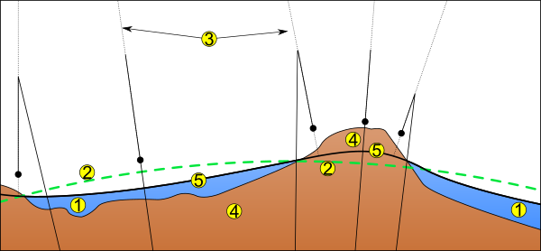 Если бы Мировой океан имел постоянную плотность, не подвергался воздействию приливов, течений и других погодных условий, его поверхность была бы близка к геоиду. Постоянное отклонение между геоидом и уровнем моря называется высотой морской поверхности. Если бы толщи континентов были пересечены рядом туннелей или каналов, уровень моря в этих каналах также почти совпадал бы с геоидом. В действительности, геоид не имеет реального физического носителя под континентами, но геодезисты могут вывести высоты точек континента над этой воображаемой поверхностью, путём нивелирования.