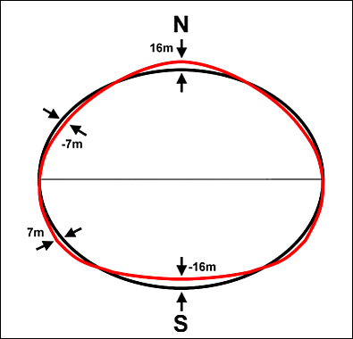 Поверхность геоида является неправильной, в отличие от эталонного эллипсоида (который является математическим идеализированным представлением формы Земли), но значительно более гладкая, чем реальная физическая поверхность Земли. Хотя реальная земная поверхность имеет отклонения высот от уровня моря от +8,848 м (гора Эверест) до −11,034 м (Марианская впадина), отклонение геоида от эллипсоида колеблется от +85 м (Исландия) до −106 м (южная Индия), в общей сложности менее 200 м[5].