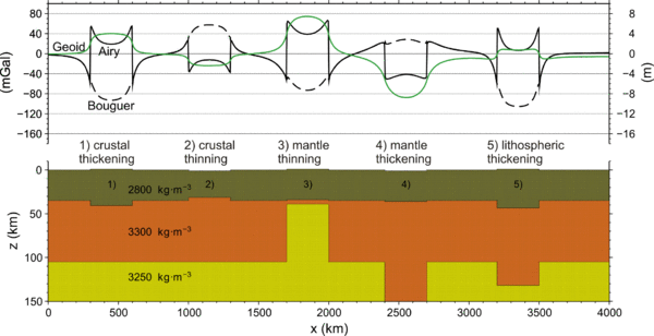 Гравитационные аномалии, вызванные аномальным распределением плотности земного шара, приводят к изменениям высоты поверхности геоида[11]. Таким образом, измерения геоида помогают понять внутреннюю структуру нашей планеты. Расчёты показывают, что геоидальная сигнатура утолщённой земной коры (например, в тектогенезе, вызванном столкновением материков) является положительной, в противоположность тому, что следует ожидать, если утолщение затрагивает всю литосферу.