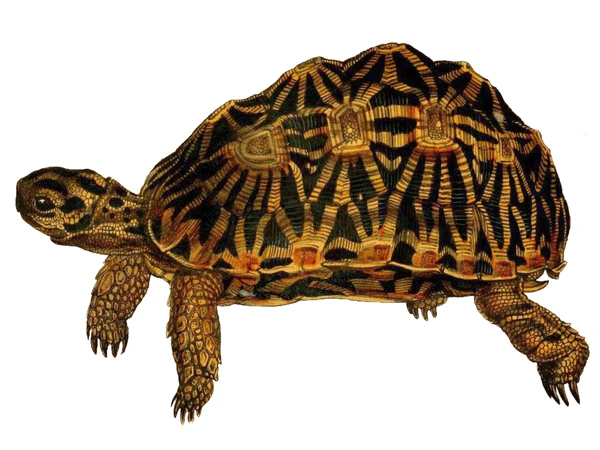 Длина панциря до 15 (по другим данным — до 24) см. Он высокий, щитки карапакса бугорчатые и рельефные. Окрашены нарядно: из центра каждого щитка на чёрно-коричневом фоне расходятся жёлтые радиальные линии, образуя сложный геометрический узор. Лапы, голова и шея тёмные, с жёлтым узором. Самки крупнее самцов. Бедренных шпор нет.