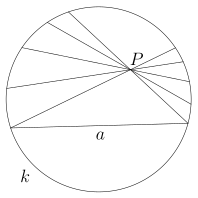 Плоскостью служит внутренность круга, прямой — хорда круга без концов, а точкой — точка внутри круга. «Движением» назовём любое преобразование круга в самого себя, которое переводит хорды в хорды. Соответственно, равными называются фигуры внутри круга, переводящиеся одна в другую такими преобразованиями. Тогда оказывается, что любой геометрический факт, описанный на таком языке, представляет теорему или аксиому геометрии Лобачевского. Иными словами, всякое утверждение геометрии Лобачевского на плоскости есть не что иное, как утверждение евклидовой геометрии, относящееся к фигурам внутри круга, лишь пересказанное в указанных терминах. Евклидова аксиома о параллельных здесь явно не выполняется, так как через точку , не лежащую на данной хорде а (то есть «прямой»), проходит сколько угодно не пересекающих её хорд («прямых») (например, , ).