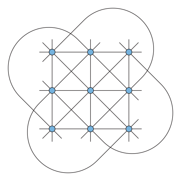 12 прямых могут быть разбиты на четыре класса, внутри которых прямые попарно не пересекаются. Эти классы называются классами параллельности прямых. Если добавить ещё четыре новые точки, по одной точке в каждый класс параллельности, и считать, что все прямые класса параллельности пересекаются в этой новой точке (таким образом, теперь все прямые теперь пересекаются), и добавить ещё одну прямую, содержащую все четыре новые точки, получим проективную плоскость порядка три, конфигурацию (134). В обратную сторону, начав с проективной плоскости порядка три (такая плоскость единственна) и удалив любую (одну) прямую и все лежащие на ней точки, получим аффинную плоскость порядка три (она тоже единственна).
