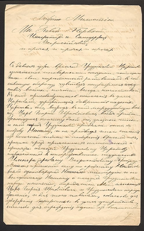 В Петербурге грузинское посольство 24 июня 1800 года передало коллегии иностранных дел проект документа о подданстве. Первый пункт гласил: царь Георгий XII «усердно желает с потомством своим, духовенством, вельможами и со всем подвластным ему народом однажды навсегда принять подданство Российской империи, обещаясь свято исполнять все то, что исполняют россияне»[12].