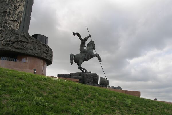 На гербе Грузии изображён геральдический щит красного цвета с Георгием Победоносцем, поражающим змея.