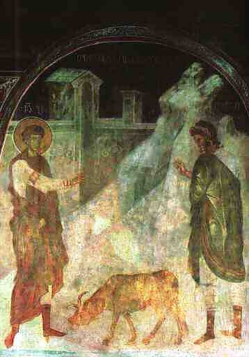 - На 7-й день его принудили выпить две чаши со снадобьями, приготовленными волхвом Афанасием, от одной из которых он должен был лишиться разума, а от второй — умереть. Но они не повредили ему. Затем он совершил несколько чудес (воскресил умершего и оживил павшего вола), что заставило многих обратиться в христианство[7].