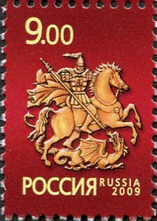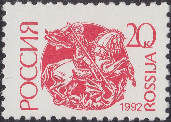 В настоящее время эта фигура в гербе Российской Федерации описывается как «серебряный всадник в синем плаще на серебряном коне, поражающий серебряным копьем чёрного опрокинутого навзничь и попранного конём дракона»[38], то есть без прямой ссылки на св. Георгия, и изображается без нимба.
