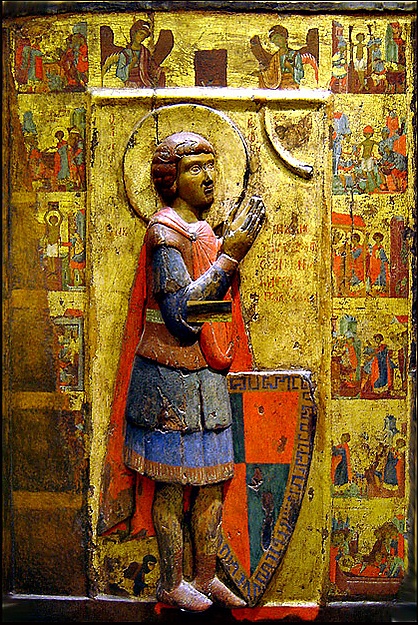 Также в апокрифе о святом великомученике Никите Бесогоне[13], известном с XI века, упоминается Георгий, «замученный Дадианом», и спрашивается, что не он ли подучил Никиту уничтожить золотых языческих идолов. Иконографический образ Никиты Бесогона из этого жития, о поверженном им бесе-дьяволе, и многократных попытках Максимиана его мученически казнить, чему мешали чудеса, иногда сливается с образом Георгия.