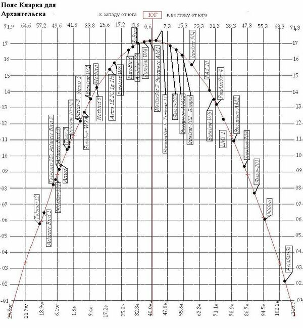Таблица наблюдаемого сектора геостационарной орбиты в зависимости от широты места