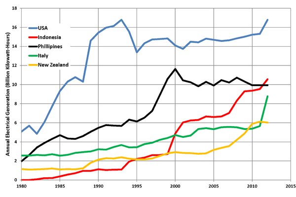 В 1958 году, когда была введена в эксплуатацию электростанция Вайракей, Новая Зеландия стала вторым крупным промышленным производителем геотермальной электроэнергии. Вайракей была первой станцией непрямого типа.[4] В 1960 году «Pacific Gas and Electric» начала эксплуатацию первой успешной геотермальной электростанции в США на гейзерах в Калифорнии.[5] [6] Первая геотермальная электростанция бинарного типа была впервые продемонстрирована в 1967 году в Советском Союзе, а затем представлена в США в 1981 году,[5] после энергетического кризиса 1970-х годов и значительных изменений в политике регулирования. Эта технология позволяет использовать гораздо более низкую температуру для производства электроэнергии, чем ранее. В 2006 году в Чина-Хот-Спрингс, штат Аляска, заработала станция бинарного цикла, производящая электричество с рекордно низкой температурой жидкости 57 °C.[7] До недавнего времени геотермальные электростанции строились исключительно там, где вблизи поверхности имелись высокотемпературные геотермальные источники. Появление электростанций с бинарным циклом и совершенствование технологии бурения и добычи могут способствовать появлению геотермальных электростанций в значительно большем географическом диапазоне. Демонстрационные электростанции находятся в германском городе Ландау-ин-дер-Пфальц и французском городе Сульц-су-Форе, в то время как ранее работы в Базеле, Швейцария, были закрыты после того, как это вызвало землетрясения. Другие демонстрационные проекты находятся в стадии разработки в Австралии, Соединенном Королевстве и Соединенных Штатах Америки.[8]