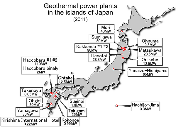 В апреле 2011 года Министерство окружающей среды Японии опубликовало доклад "Исследование потенциала внедрения возобновляемых источников энергии".[9] Согласно этому докладу суммарный геотермальный ресурсный потенциал Японии оценён в 19.14 ГВт.[8]