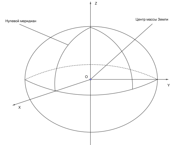 Геоцентрические координаты — астрономические сферические величины (долгота, широта), определяющие положение точки. Начало отсчета системы совпадает с центром масс Земли. Строго относится к Земле, как к небесному телу. Аналогичные системы применяются к другим небесным телам и имеют собственные наименования — Селеноцентрическая (не стоит путать с селенографическими координатами, Гелиоцентрическая (не стоит путать с Барицентрическими координатами) и прочие. Ось Z — проходящая через точки Зенит и Надир — задает направление на север, для северного полушария. Ось Х — лежит в плоскости Экватора, задает направление на Нулевой меридиан (осевой меридиан зоны в проекции Гаусса — Крюгера). Ось Y — лежит в плоскости Экватора и дополняет систему до правой.[1][2][3][4]